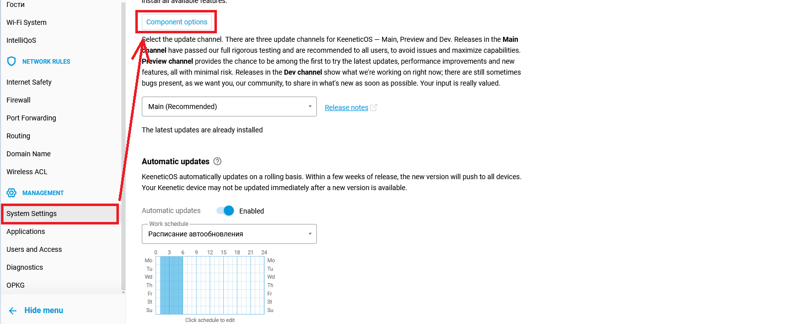 1. Open the router’s web interface in a browser: http://192.168.1.1 (or specify a different router IP address) and go to: System Settings → Component options: