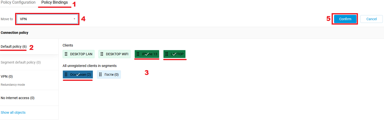 3. Open the "Policy Bindings" section. In the list on the left, select the policy from which you need to move devices or connection segments (in this example — "Default Policy"):