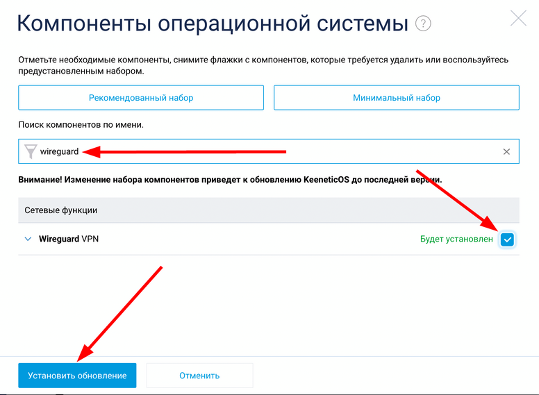 3. Введите в поисковой строке «wireguard», затем установите галочку напротив «Wireguard VPN» и нажмите кнопку «Установить обновление»