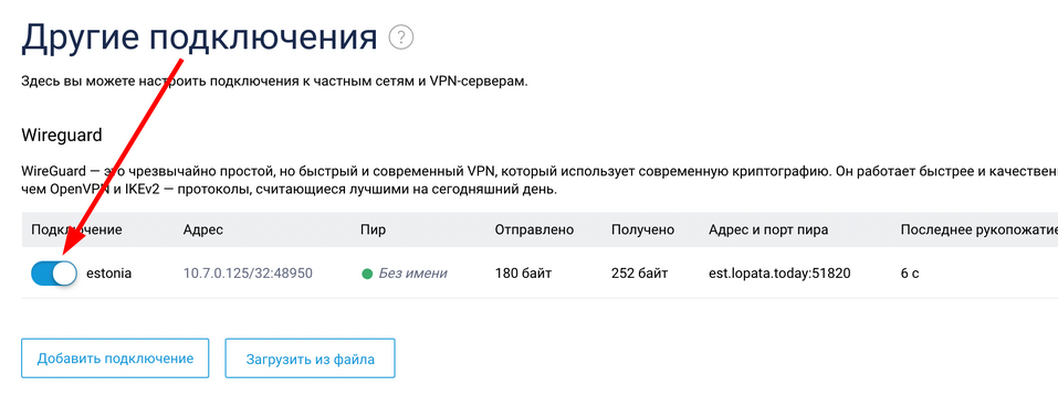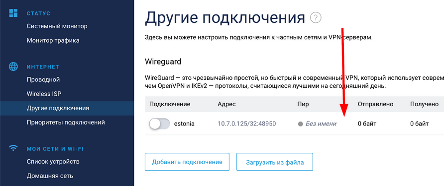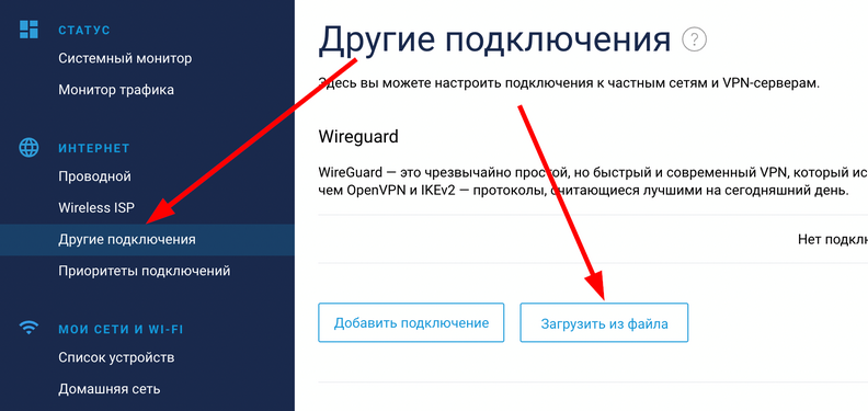5. Снова откройте интерфейс роутера, выберите меню «Другие подключения». Нажмите кнопку «Загрузить из файла» и выберите файл, полученный из конфигуратора WireGuard.