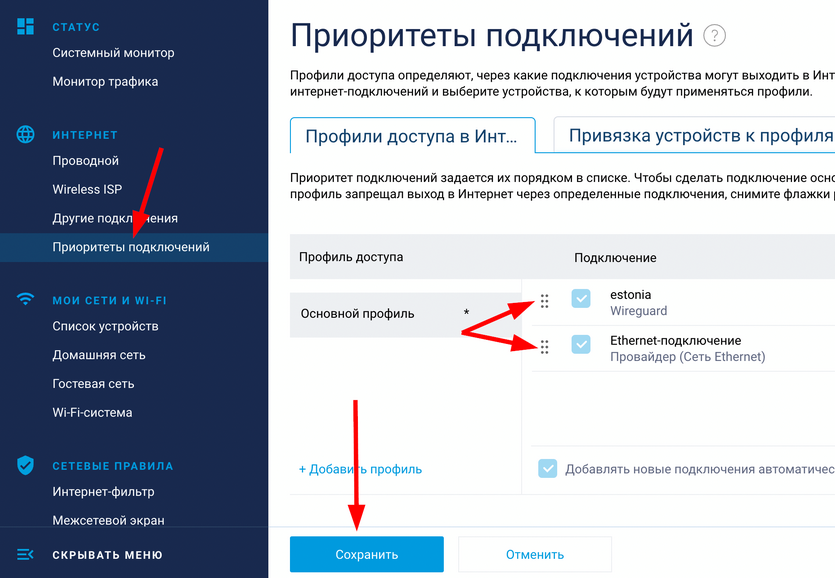 9. Откройте меню «Приоритеты подключений» и поменяйте местами добавленное VPN-подключение и проводное соединение, так, чтобы VPN-подключение было первым. Нажмите «Сохранить».
