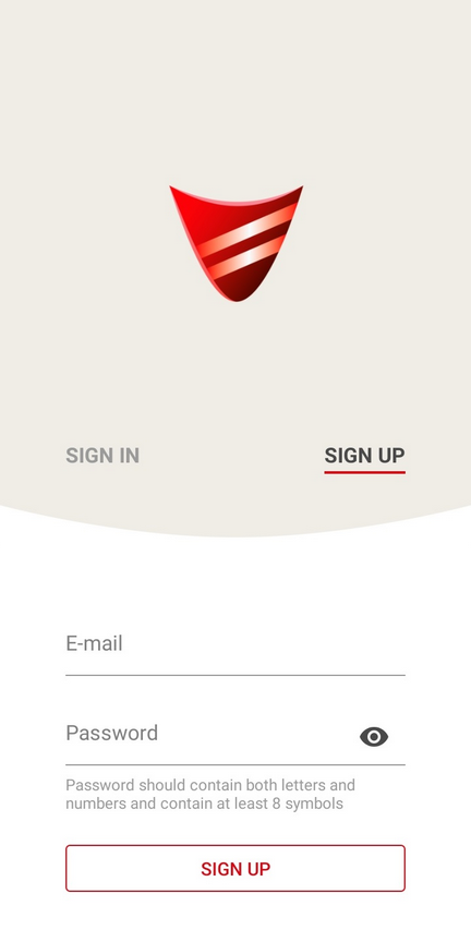 1. 安装并运行 Red Shield VPN 应用。要注册,请输入您的电子邮箱和密码;如果您已经注册了 Red Shield VPN,请使用已有账户登录。